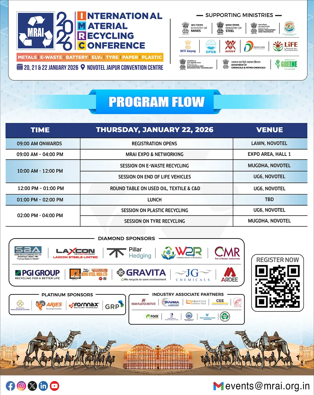 Thanks to the continuous trust and overwhelming support of its 1700+ Member Companies, MRAI is delighted to announce the Latest Edition of the International Material Recycling Conference & Exposition #IMRC2026, to be held at the Novotel Jaipur & Convention Centre, in Jaipur, India, on January 20, 21 & 22, 2026.